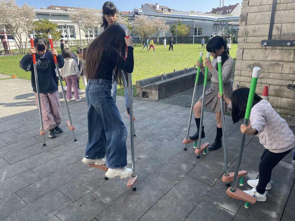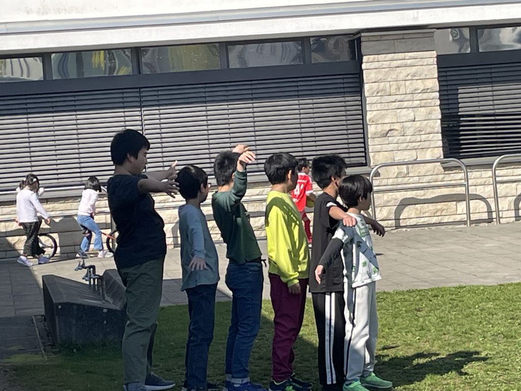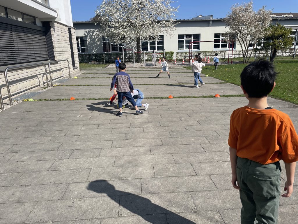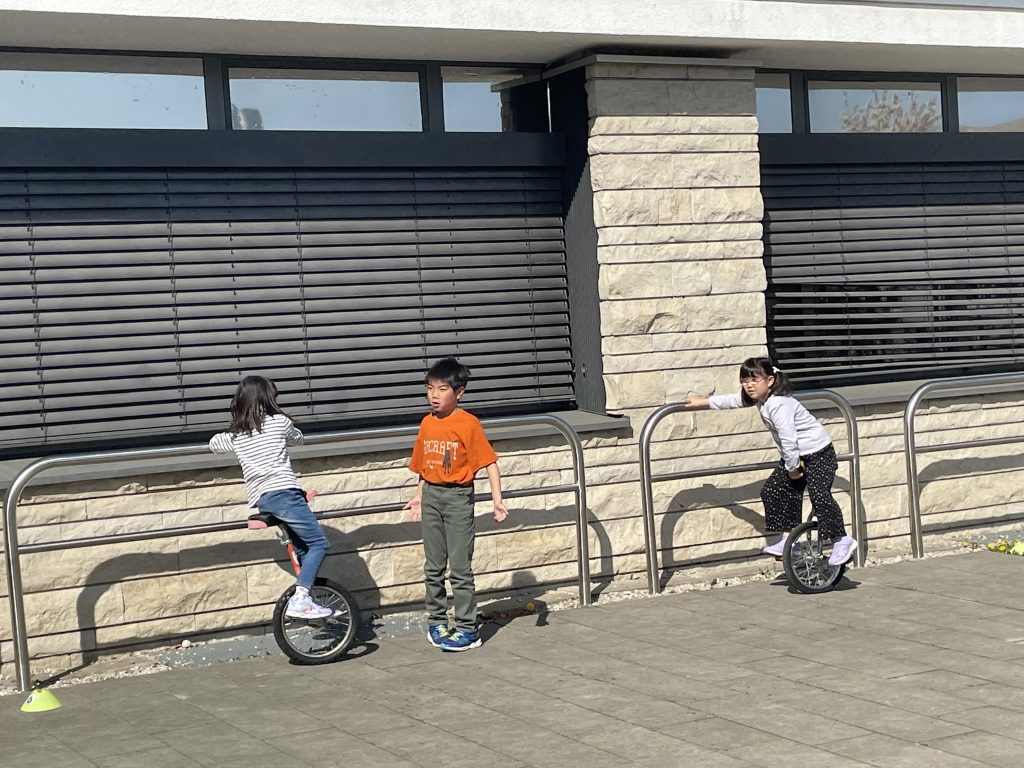 中庭で元気よく遊ぶ子どもたちの様子です。友達や先生と鬼ごっこをしたり、ドッジボールをしたりして笑顔いっぱいで楽しんでいます。今年、買った新しい竹馬にチャレンジしている子もいます。中庭に咲いている満開の花が、青空に生えてとても気持ち良い日でした。