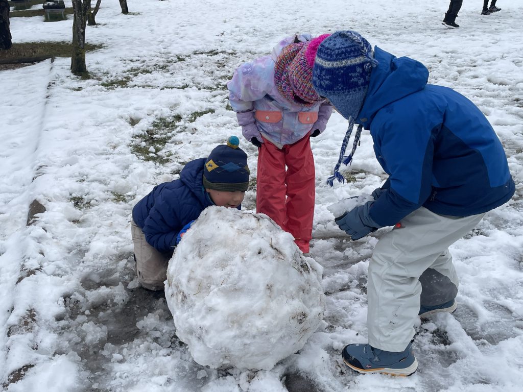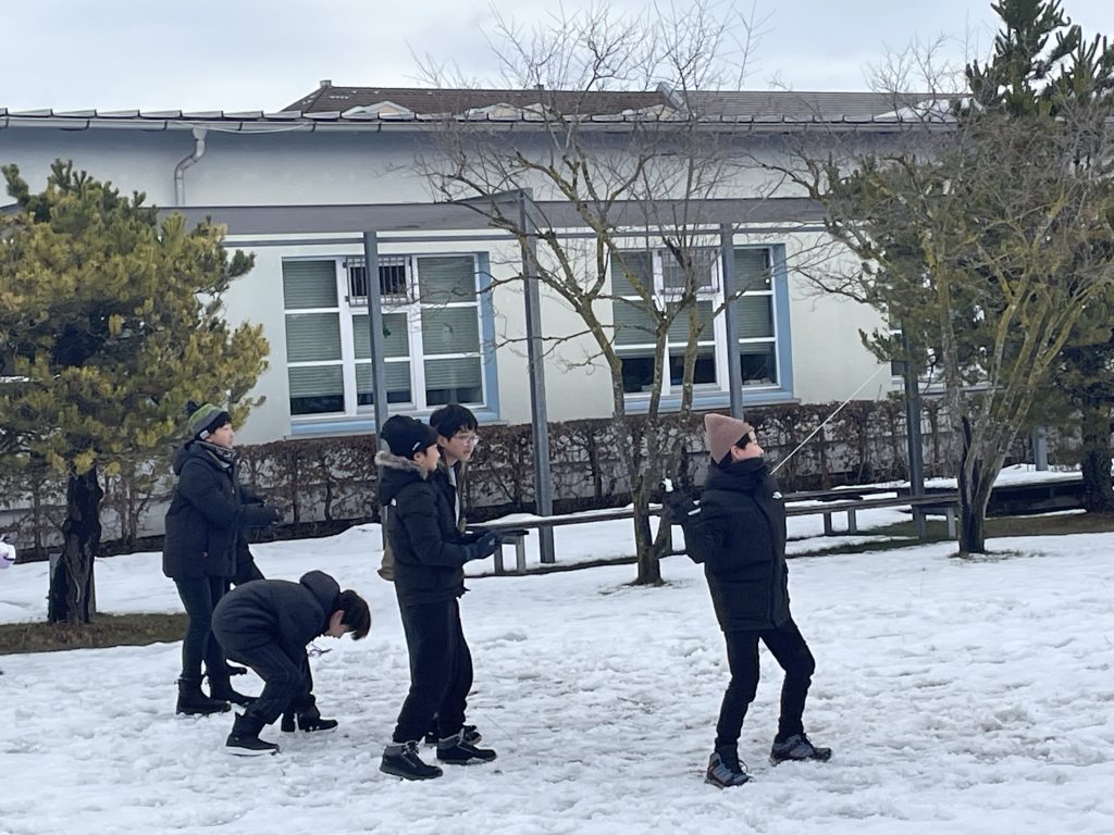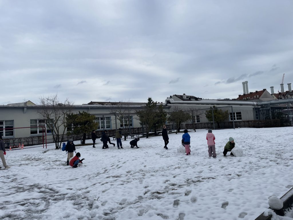 ミュンヘンに雪が降り、子どもたちは大喜びです。中休みに、割り当てになっている2年生と6年生が雪遊びをしていました。雪だるまを作っている子どもたちは、一生懸命に雪玉を転がし雪玉は見る見るうちに大きくなっていきました。一人で押せなくなると友だちと一緒に押しています。 6年生の男子は、雪玉を投げて飛ぶ距離を競っていました。今年の冬は雪が多く、昨年度できなかった雪遊びができて、子どもたちはウキウキ、ワクワクです。