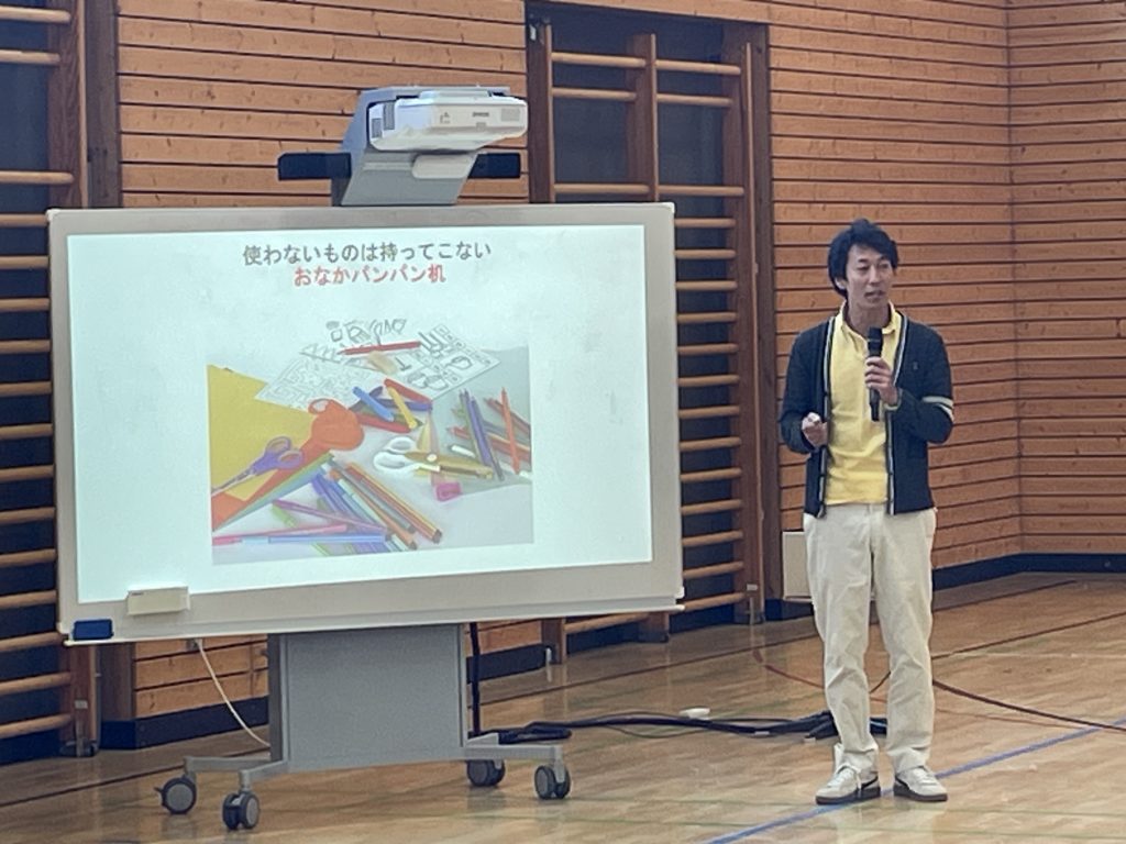 2学期の初めということで、生活指導の宮垣先生から、自分の持ち物について「おとしもの、わすれものさよなら大作戦」と題して話がありました。