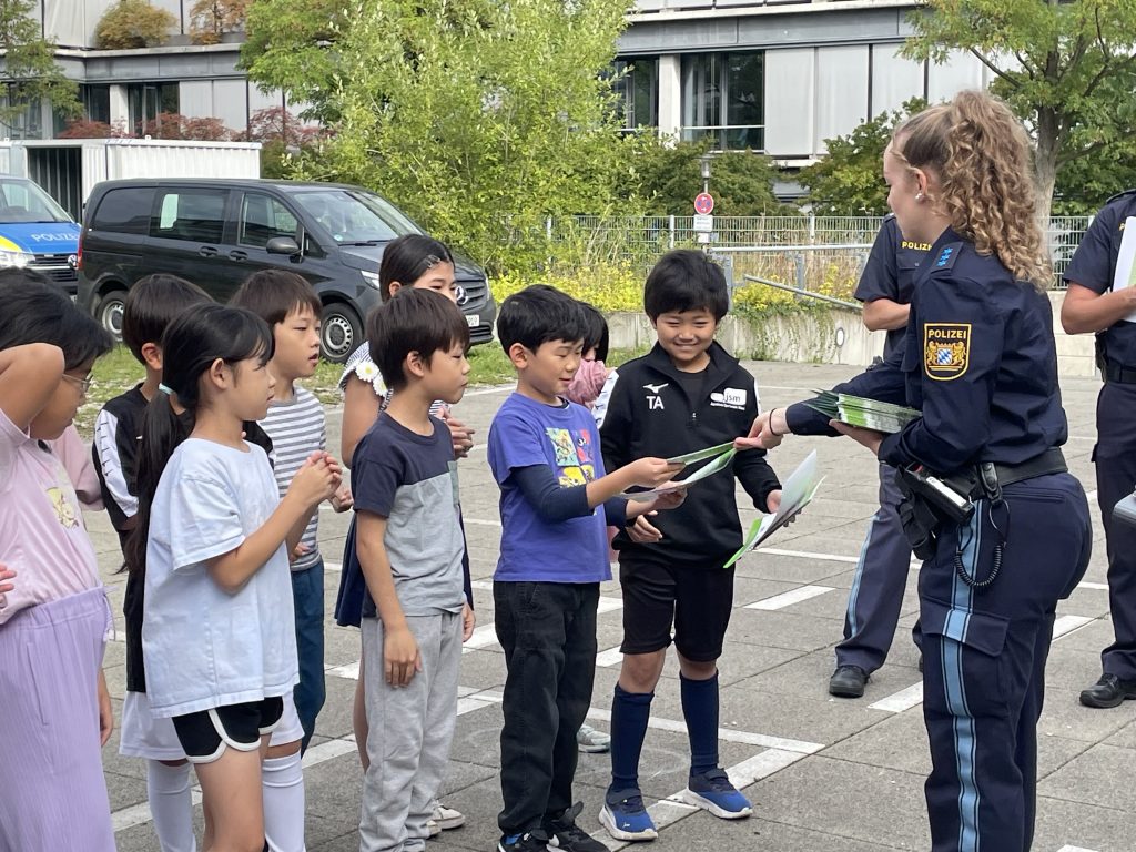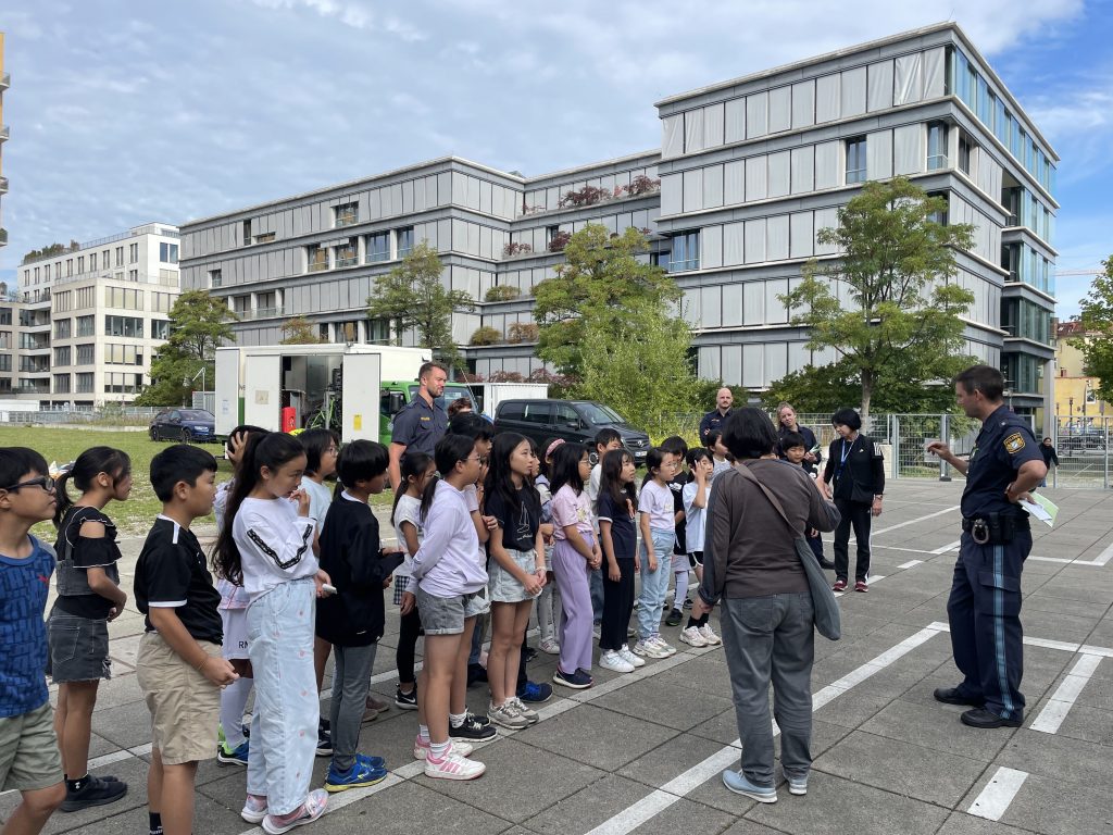 先週から小学部4年生が行っていた自転車教室実技練習の最終日でした。1週間にわたり、ミュンヘン警察署の方が丁寧に模擬道路での自転車の乗り方を指導していただきました。最終日には、今までの実技練習の成果をテストしました。最後には、テストの結果を一人ひとりコメントを付けて発表していただきました。自転車の技術とともに、安全な運転の心構えも学ぶことができました。みんなでお互いの頑張りを、拍手で讃え合っている姿がとても印象的でした。