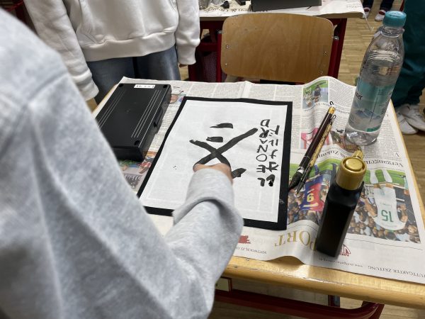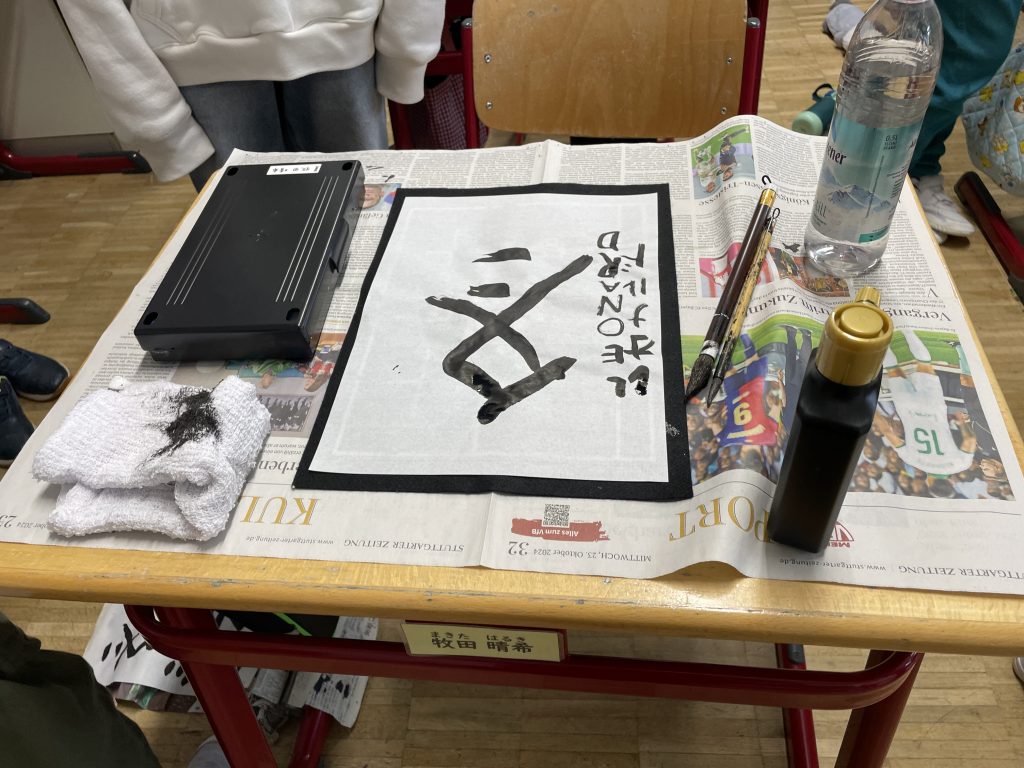 名札をあげるとき、グループを作るときなどドイツ語を使う場面のフレーズをあらかじめ練習して交流に臨みました。運動会で行った綱引きや日本の遊びなど、ドイツの友だちに体験してほしいことを考えて交流会を行いました。書道体験を5年生の教室でしました。交流後に、目標が達成できたか振り返りをしました。