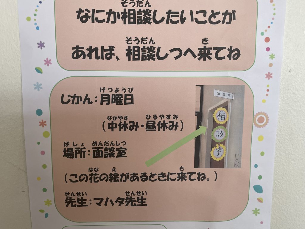 教育相談がさらに必要な場合は、校内で共有して対応を考えていきたいと思います。ご家庭でも気になることがありましたらお知らせください。また、相談室のスクールカウンセラーのマハタ先生との相談も月曜日に行っています。ご利用ください。