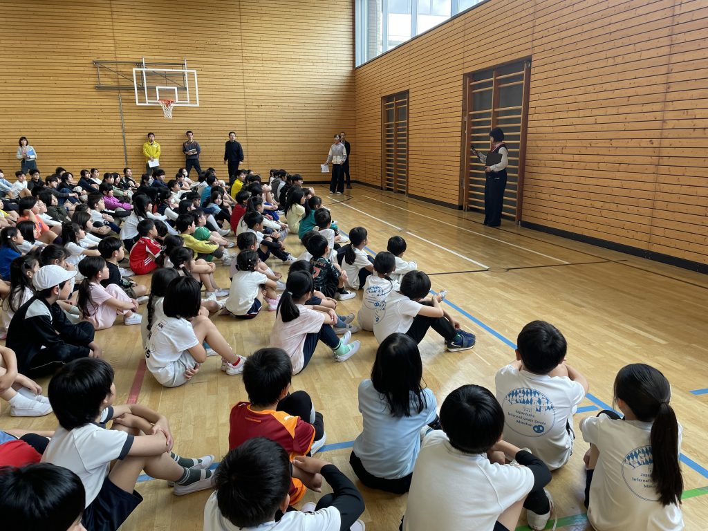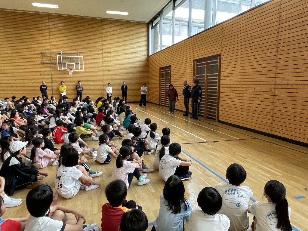 令和8年度の年度初めに、不審者対応の避難訓練を行いました。在ミュンヘン日本国総領事館の岡西安全担当領事とミュンヘン警察ゼンドリング署の二人のドイツ人警察官の方に訓練の様子を見ていただきました。入学したての1年生も、とても上手に避難できました。訓練について上記のお二人から、お褒めの言葉をいただきました。訓練であっても、真剣に取り組む子どもたちは、とても素晴らしいと思います。校長から「校内のお客さんは、赤いストラップを付けていること」から、学校内で赤いストラップの無い人を見かけたら先生などに知らせてほしいことを伝えました。また、学校外では、「周りを見ること」「心配な人がいたらそっと場所を移すこと」「いざというときは大きな声で助けを求めること」「インターネット等で知り合った人と会わないこと」を話しました。ご家庭でも、海外で生活するうえで気を付けることを話題にしていただければと思います。