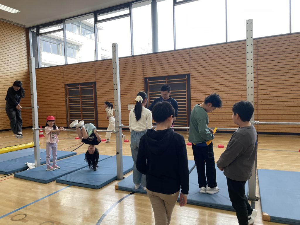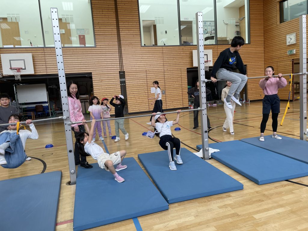 休み時間にも子どもたちが先生に指導を受けたり、見守っていただいたりしながら鉄棒の練習をしています。1年生が「逆上がりがはじめてできるようになった」と嬉しそうに話してくれました。