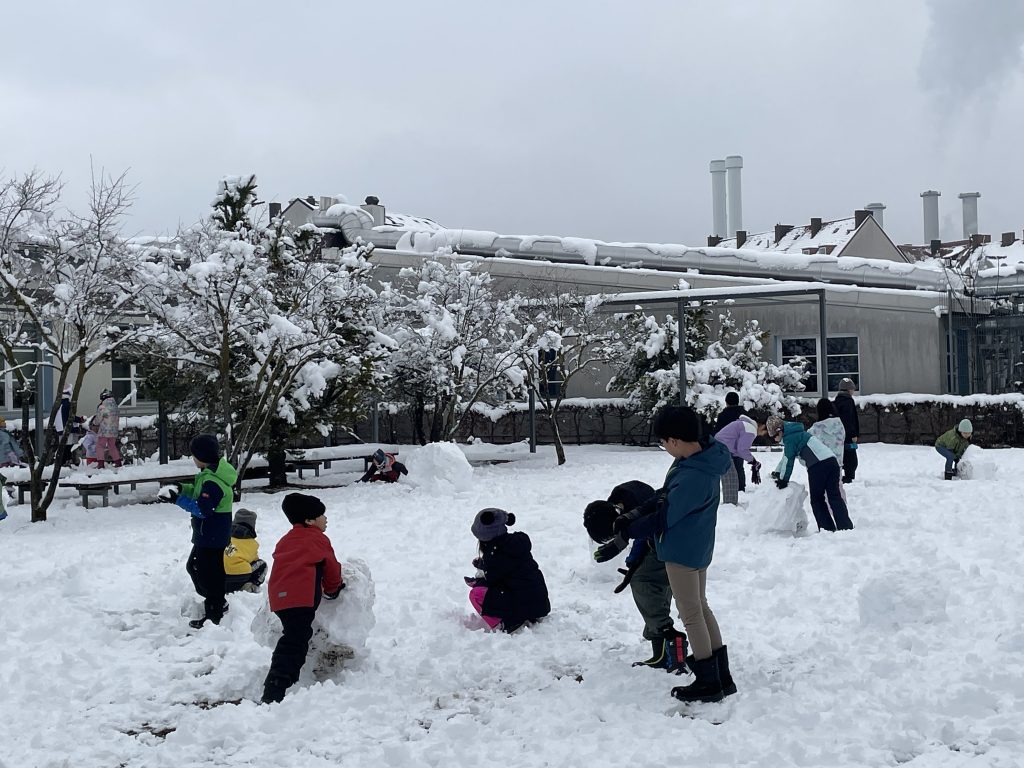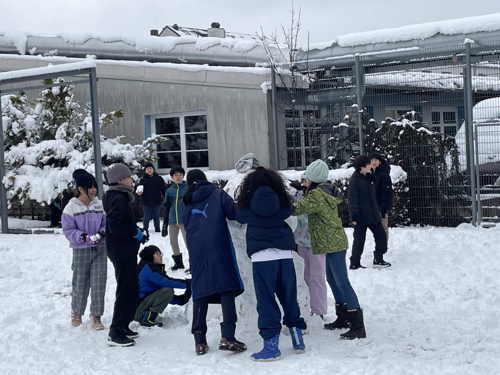 昨日降り続いた雪で学校の中庭は真っ白になりました。中休みには、遊びの割り当てになっている2年生と6年生が雪だるまを作ったり、友達と雪を掛け合ったりして楽しんでいました。日本から小さな雪だるまをつくる道具を使って小さな雪だるまを作っている子もいました。湿った雪のため、雪だるまはどんどん大きくなっていきました。中学部のみなさんは、近くの公園に行きそり滑りをしました。突然の大雪でしたが、子どもたちは大喜びです。