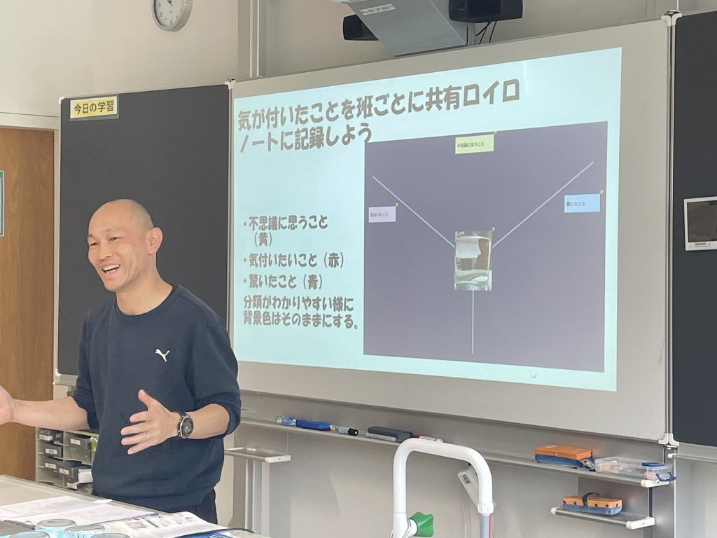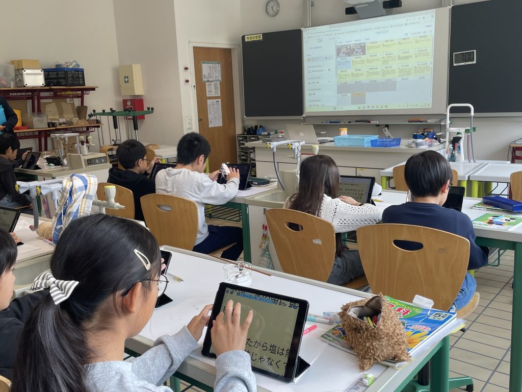 牛丸先生の「物のとけ方」の理科授業を参観し、授業研究会をもちました。授業では初めに実験の行い方を説明した後、食塩1グラムをティーパックに入れて水にとける様子を子どもたちが観察しました。「すごい」「モヤモヤがでてくる」など、塩のとける様子をみてあちこちから声が上がりました。そして、タブレットに「気づいたこと」「驚いたこと」「不思議に思ったこと」を色のついた付箋に打ち込みました。