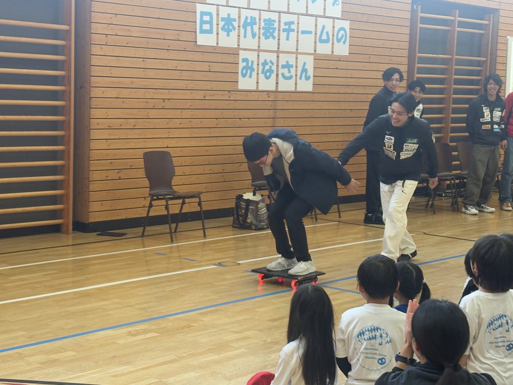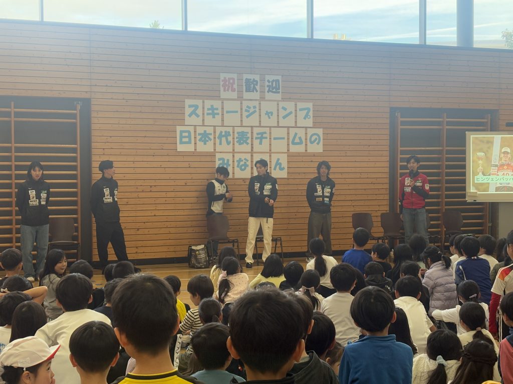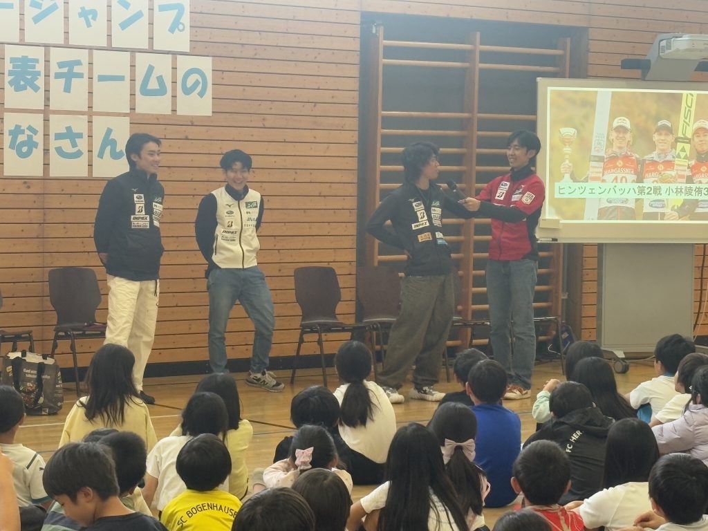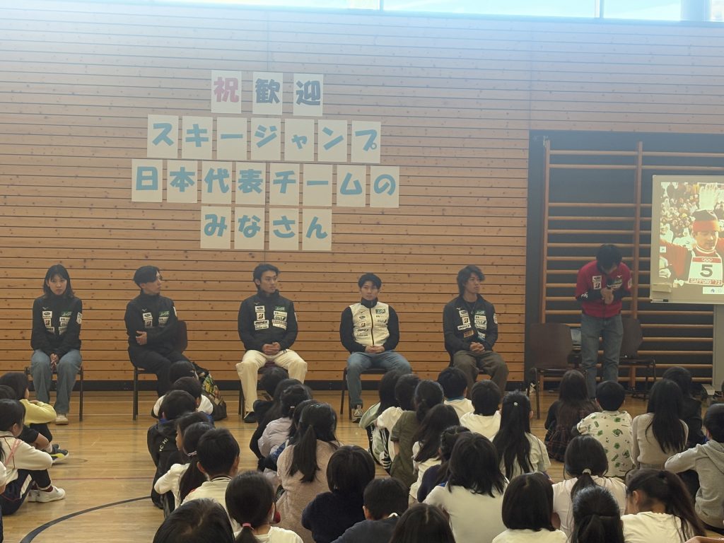 今シーズンは冬季オリンピックのあるシーズンです。校長の方から選手の今シーズンの成績や日本チームのオリンピックでの活躍の様子などを話しました。その後、選手の皆さんの自己紹介に加えて、ジャンプの助走のスピードやバランス感覚を養う練習用具の紹介などをしてくださいました。今までスキージャンプを観戦したことのある子どもは多くありませんでしたが、多くの子どもたちがこの交流会を通して新しいスポーツに興味関心をもてたようでした。